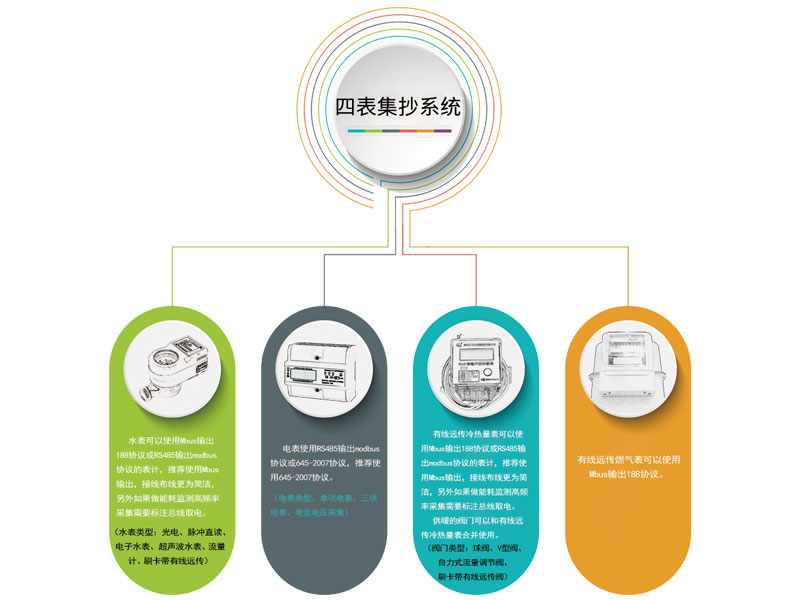 有線遠(yuǎn)傳四表集抄,是由表端(有線遠(yuǎn)傳水表、有線遠(yuǎn)傳電表、有線遠(yuǎn)傳冷熱計(jì)量表、有線遠(yuǎn)傳燃?xì)獗恚?采集集中器一體機(jī)+服務(wù)器組成,根據(jù)客戶的情況可以分為廣域網(wǎng)集抄系統(tǒng),即管理人員可以通過任意一臺(tái)連接WAN的電腦進(jìn)行抄表控制,也可以根據(jù)客戶情況選擇網(wǎng)口集中器使用內(nèi)網(wǎng)集抄,管理員可以通過任意一臺(tái)連接內(nèi)網(wǎng)服務(wù)器的電腦進(jìn)行抄表控制。